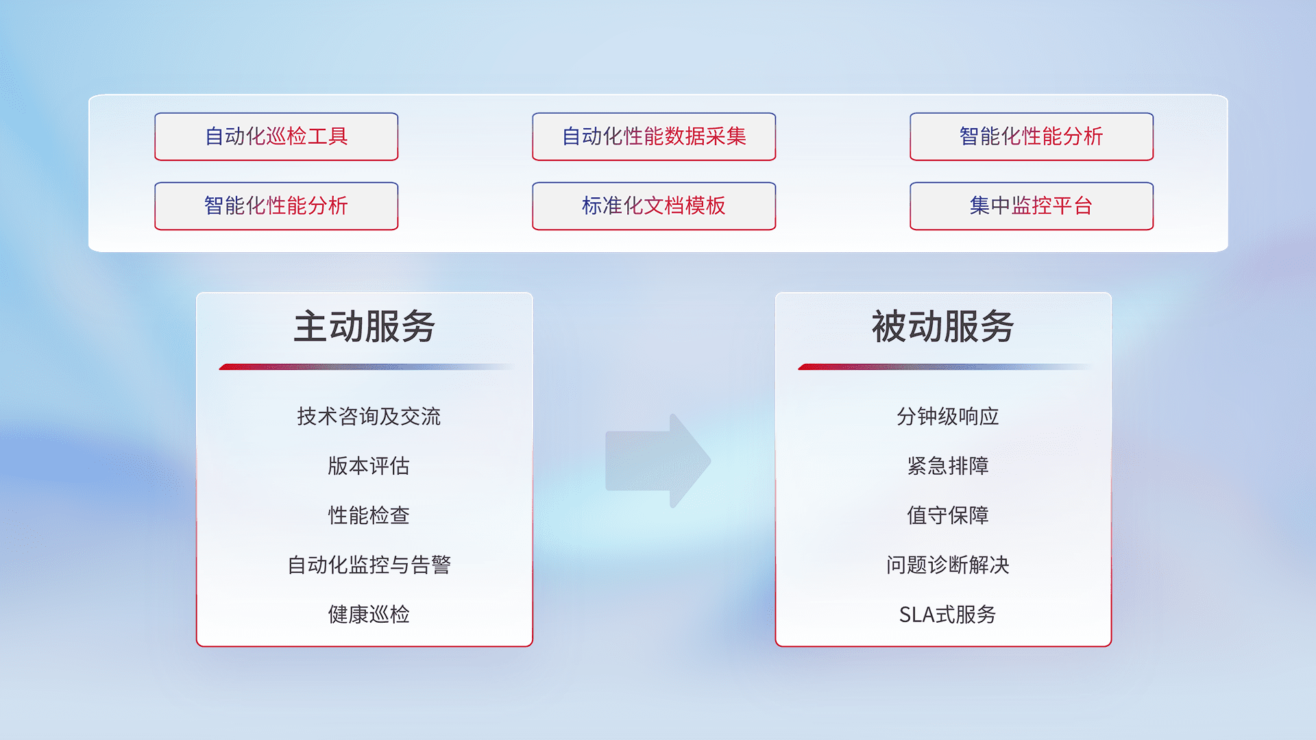 智能化工具和标准化文档,,保障服务质量,,提供主动服务(包含技术咨询、、、版本评估、、、、性能检查、、、自动化监控与告警、、、健康巡检)和被动服务包含(分钟级响应、、、、紧急排障、、、值守保障、、、、问题诊断解决、、、SLA服务)。。。。